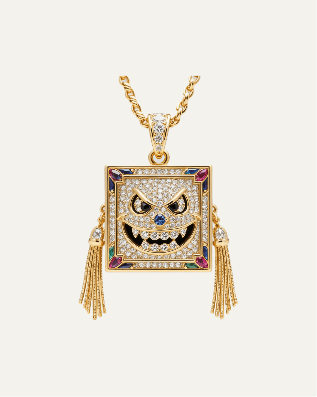The Structured Frame: A perfectly symmetrical Square Silhouette sets the stage. It’s bold, geometric, and sits flat against the chest for a commanding presence. Double Kinetic Tassels: Unlike standard pendants, this piece features Two Diamond-Set Tassels hanging from the bottom corners. They swing with every step, adding dynamic movement to the rigid frame.