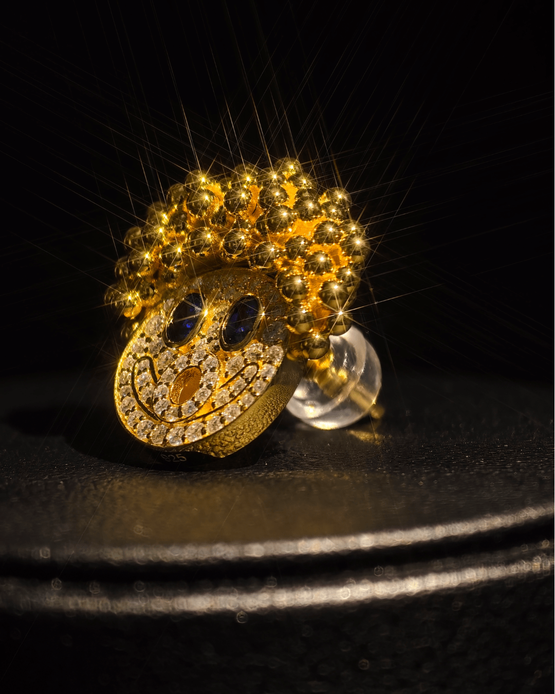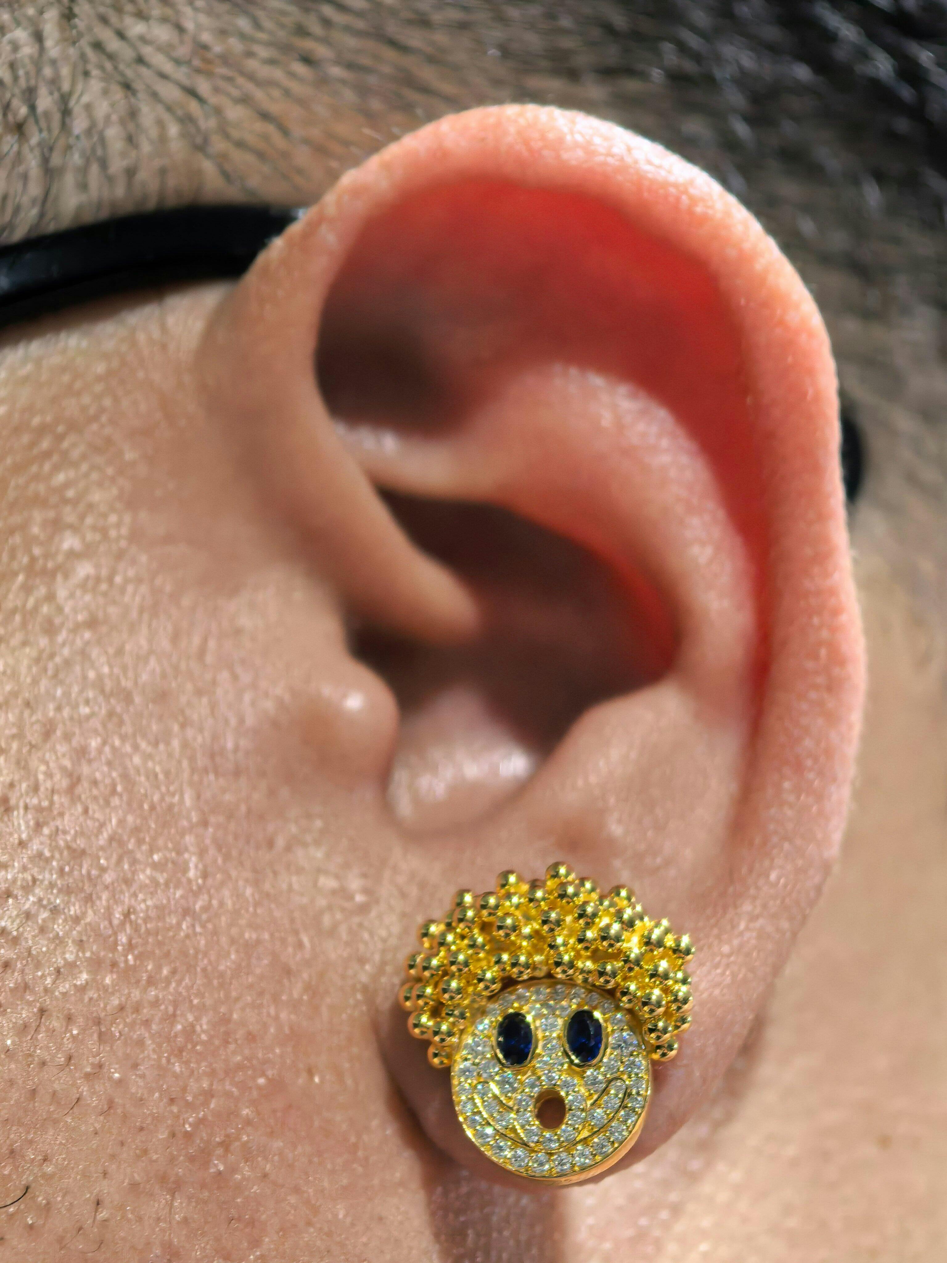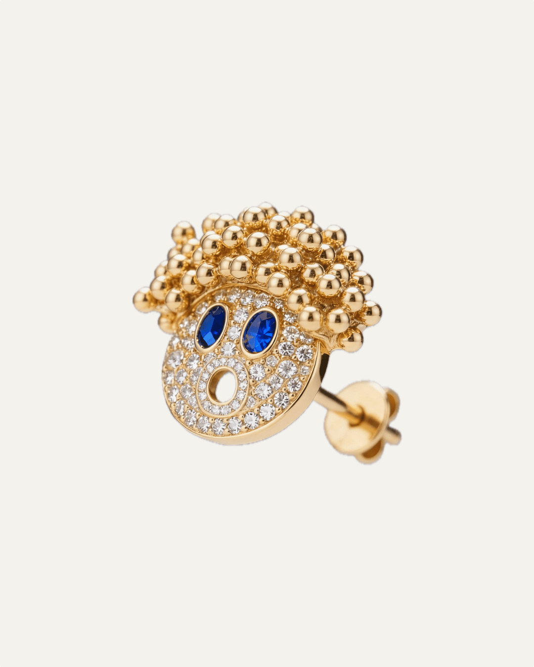 Stare into the hype. The focal point of this stud is the pair of piercing Blue Sapphire-colored stones set as the eyes, creating a striking contrast against the gold. The mouth is frozen in a perfect "O" of astonishment, lined with black accents. Surrounded by our signature textured "hair" and flooded with VVS Moissanite, this piece is pure electric energy.