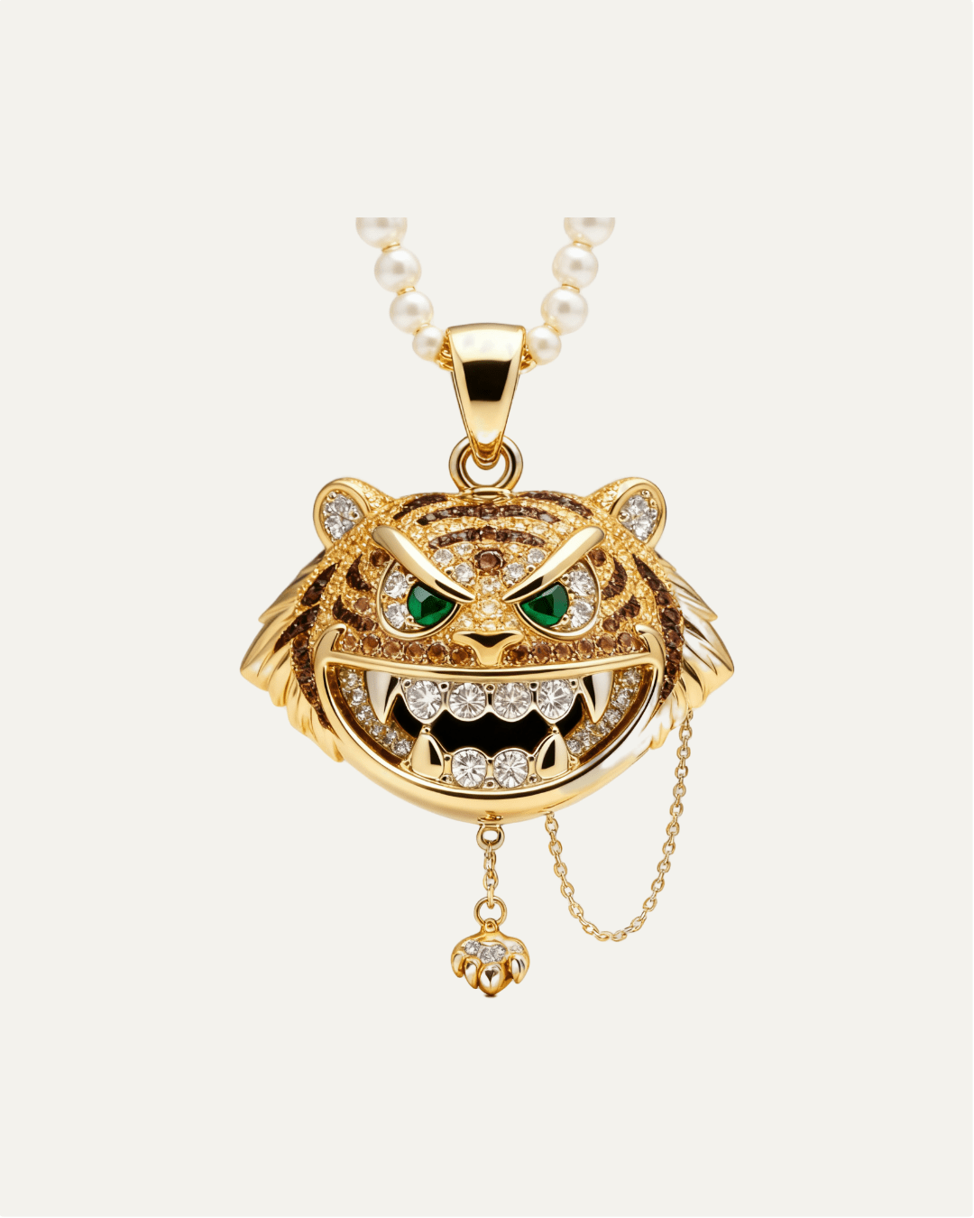 Kinetic Charm: A delicate gold charm hangs from the chin, adding movement and a touch of playful elegance to the fierce design.