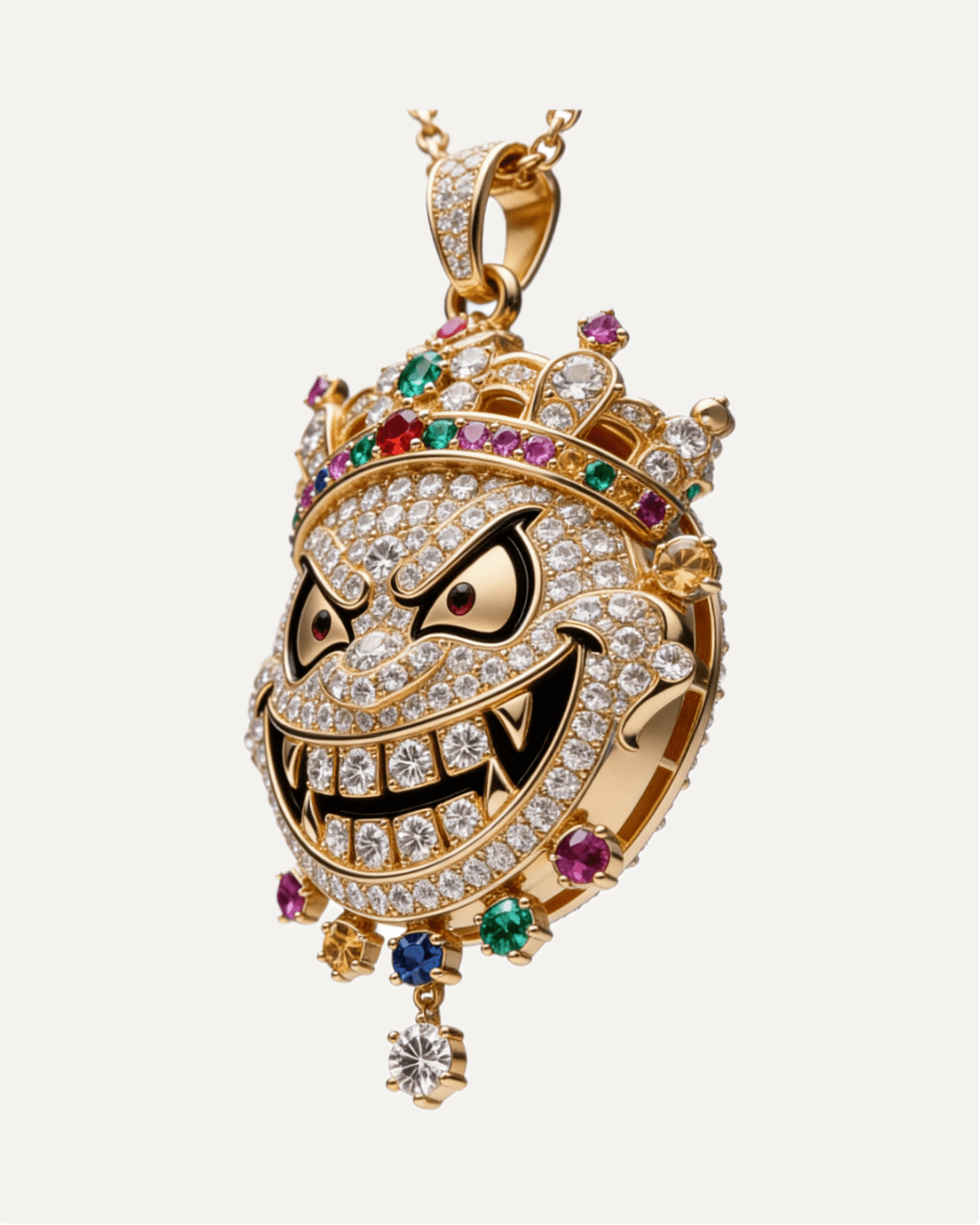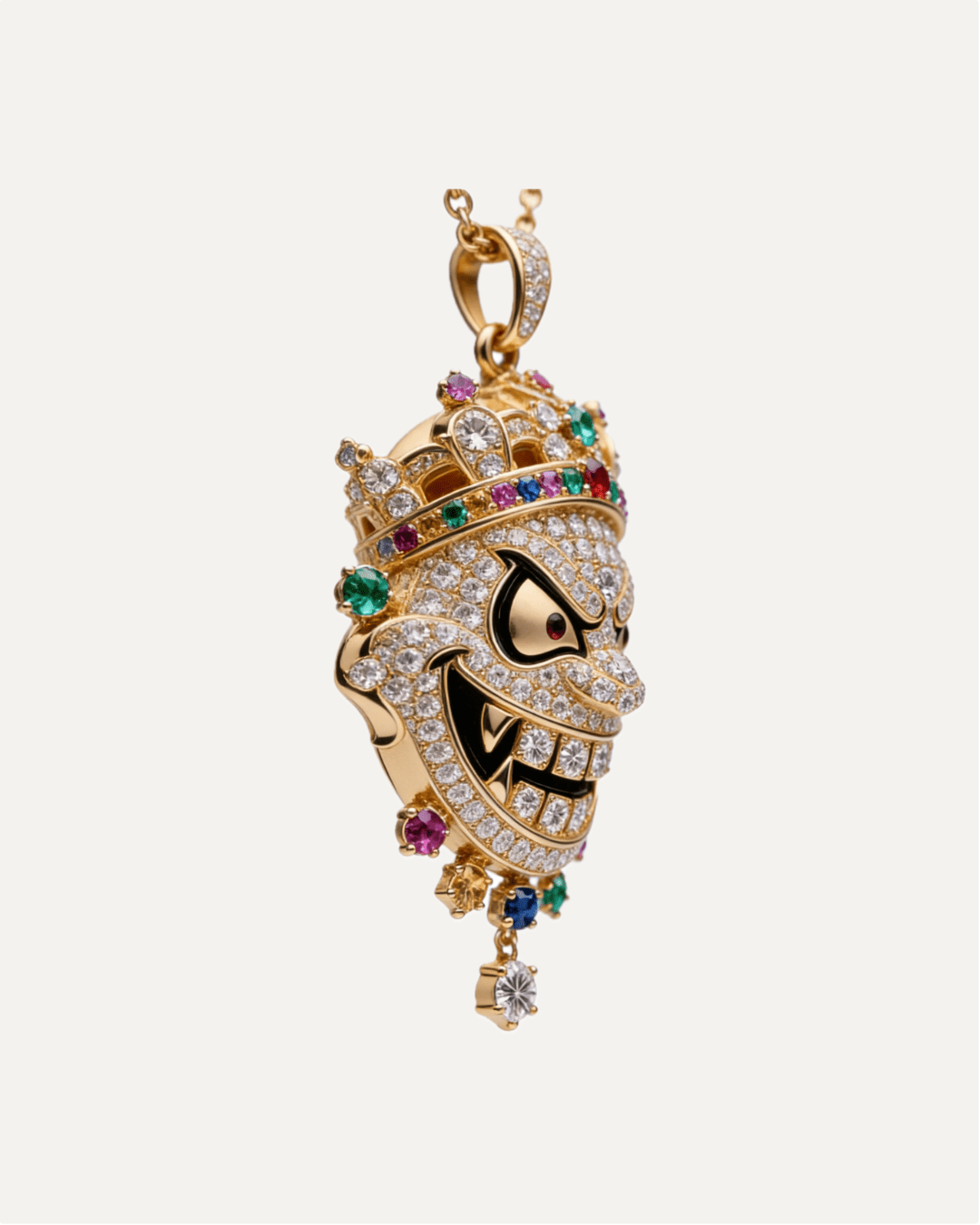 The Kinetic Drop: Features a unique, free-moving solitaire diamond dangling from the chin. It catches the light with every movement, creating a constant "drip" effect. 3D Architecture: A fully sculpted masterpiece. From the gritted teeth to the texture of the crown, every angle is polished to perfection.
