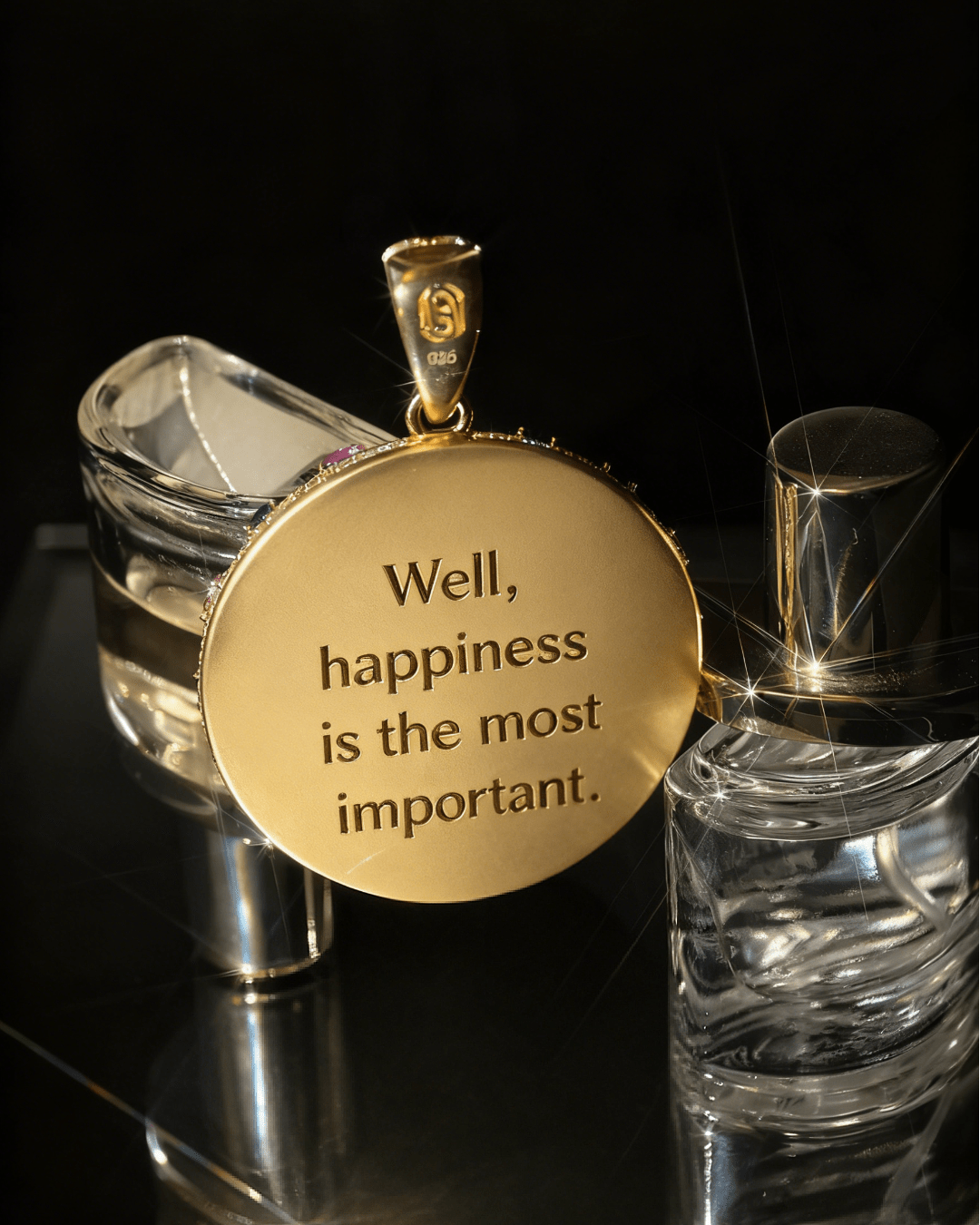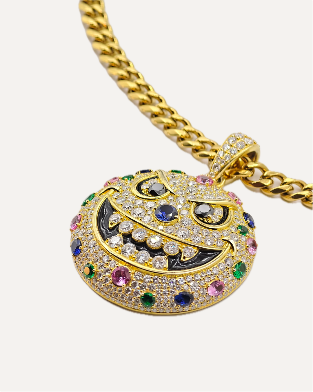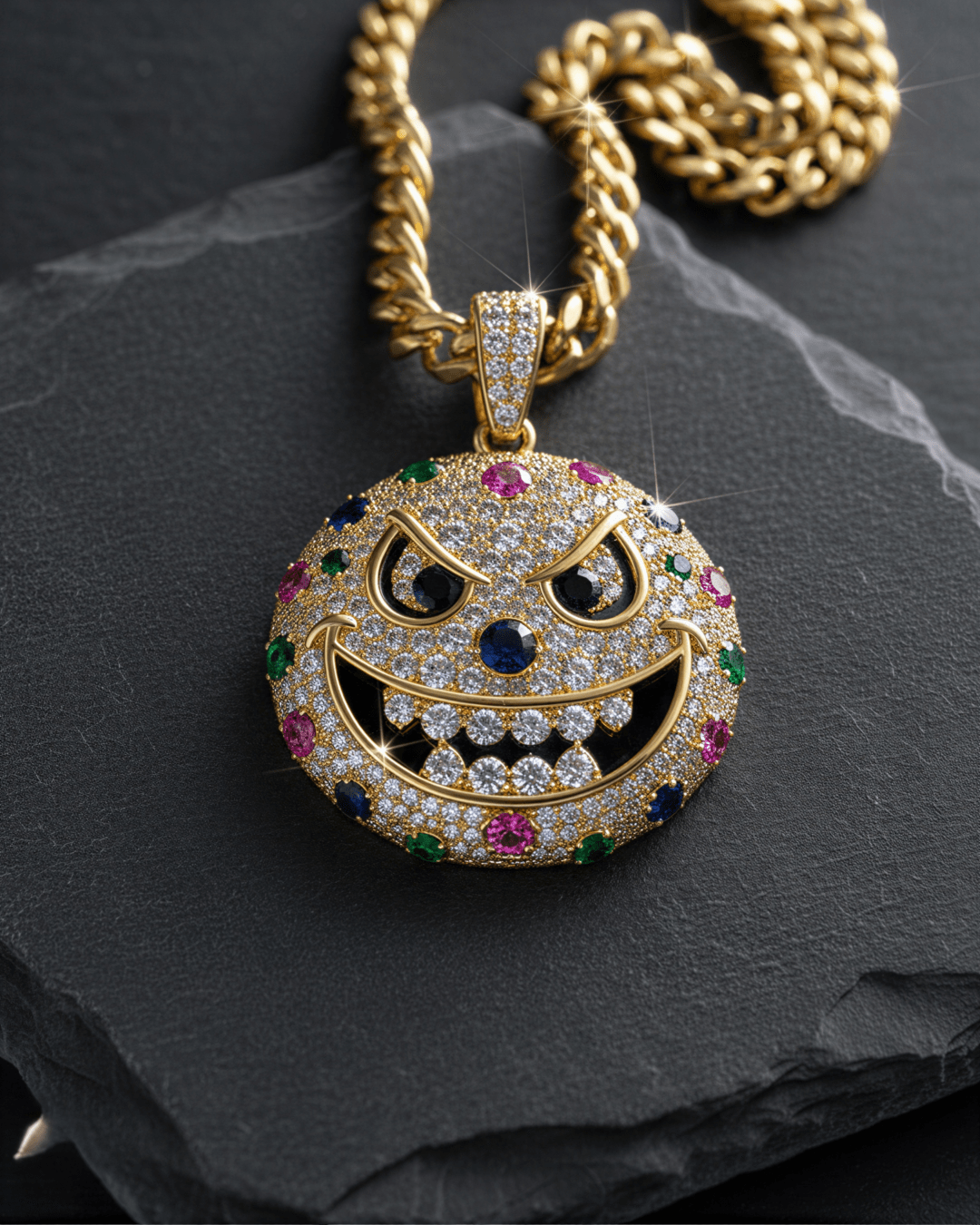 360° 3D Sculpture: Unlike cheap flat pendants, this is a fully 3D sphere (13mm thickness). It pops off your chest with depth and shadows. Psychedelic Shine: We used a crazy mix of Multi-Color Moissanite—Pink/Purple for the eyes, Blue for the "sweat," and icy White/Yellow for the face. It’s a trippy visual experience. The Hidden Message: Flip it over. The solid back is laser-engraved with the mantra: "Well, happiness is the most important." A secret reminder just for you.
