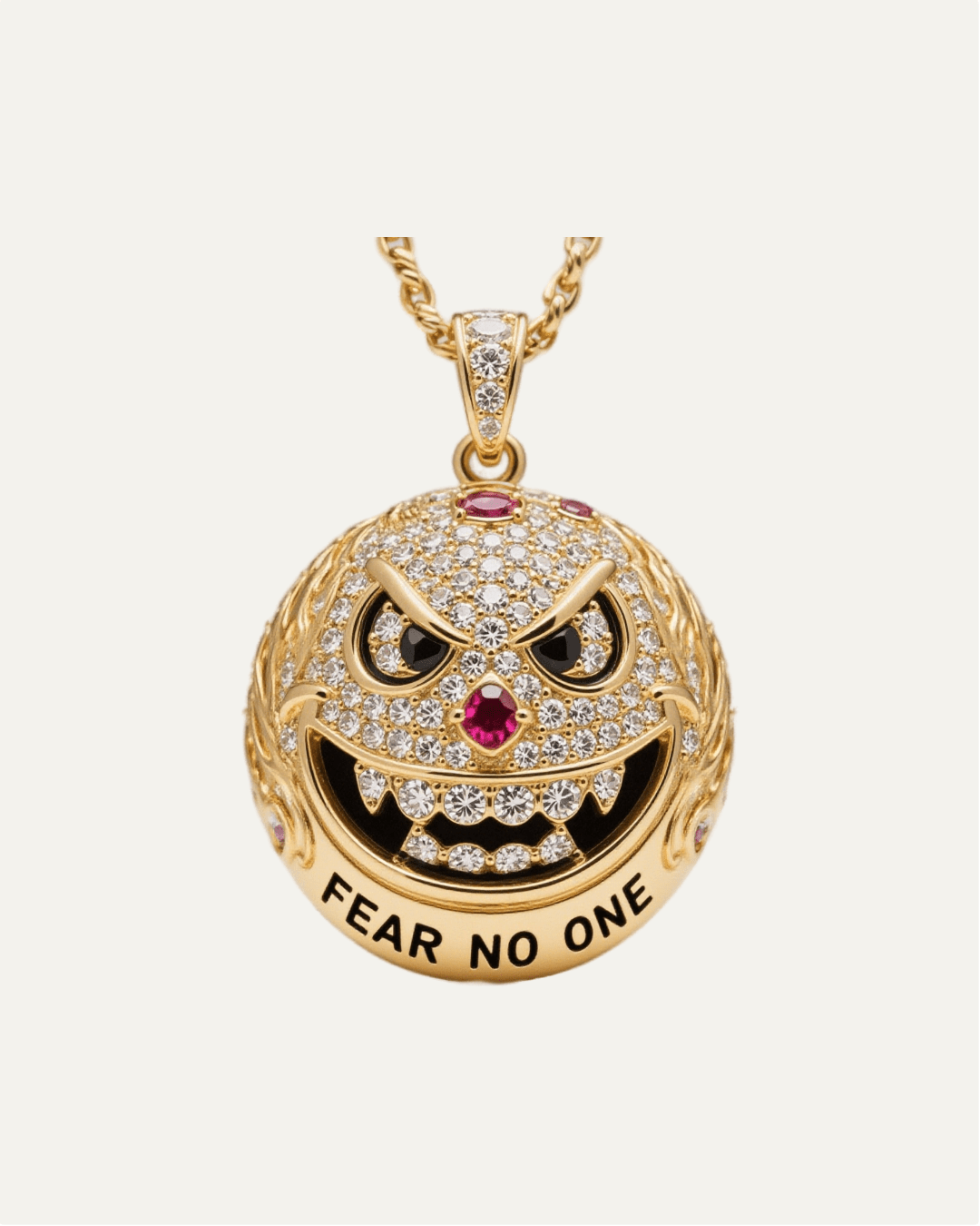 Walk like a King, or walk like you don't care who the King is. Fear is a choice, and you chose to conquer it. The Signature Smirk isn't just a pendant; it's a warning label. With piercing red eyes and the mantra "FEAR NO ONE" engraved boldly on the rim, this piece is for the man who stands his ground.